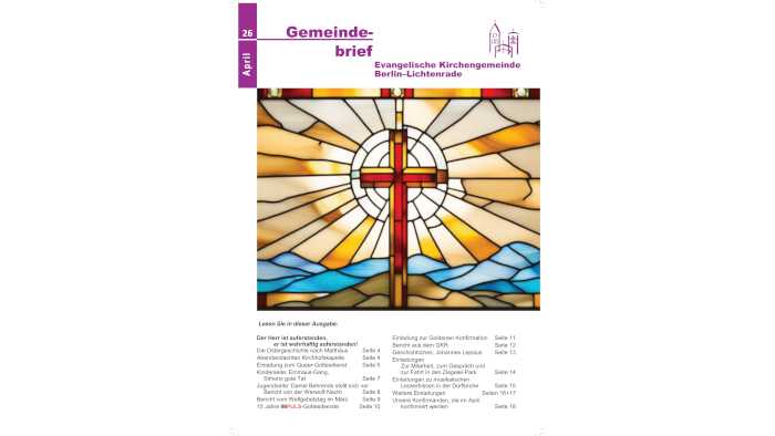 Unsere Online-Version des April-Gemeindebriefs liegt für Sie ab heute bereit. Klicken Sie einfach hier und Sie sehen schon jetzt, was erst in den nächsten Tagen in gedruckter Form erhältlich ist.