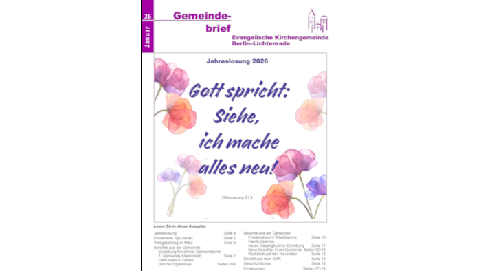 Unsere Online-Version des Januar-Gemeindebriefs liegt für Sie ab heute bereit. Klicken Sie einfach hier und Sie sehen schon jetzt, was erst in den nächsten Tagen in gedruckter Form erhältlich ist.