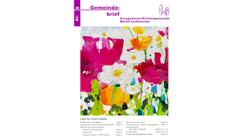 Unsere Online-Version des Mai-Gemeindebriefs liegt für Sie ab heute bereit. Klicken Sie einfach hier und Sie sehen schon jetzt, was erst in den nächsten Tagen in gedruckter Form erhältlich ist.