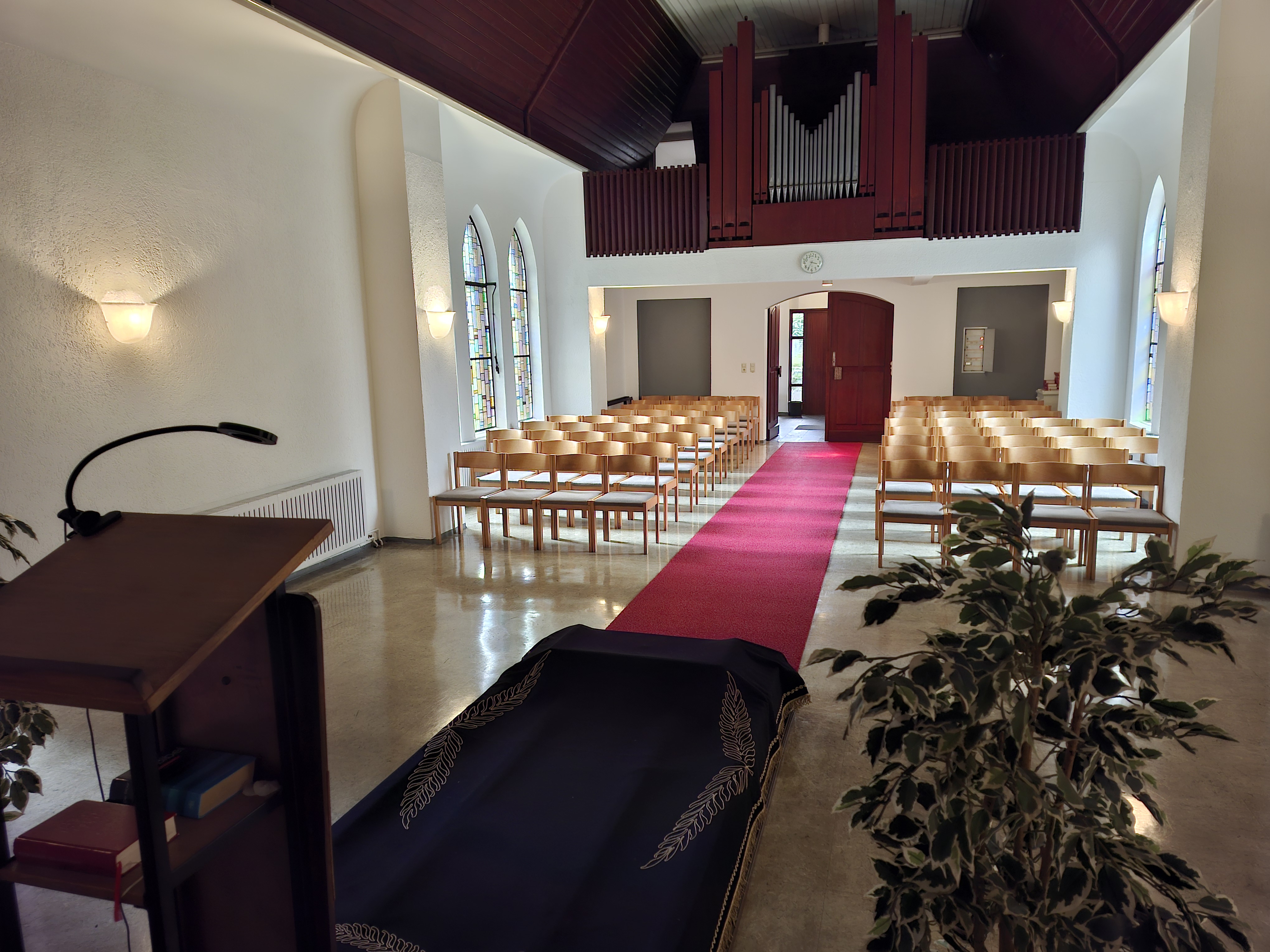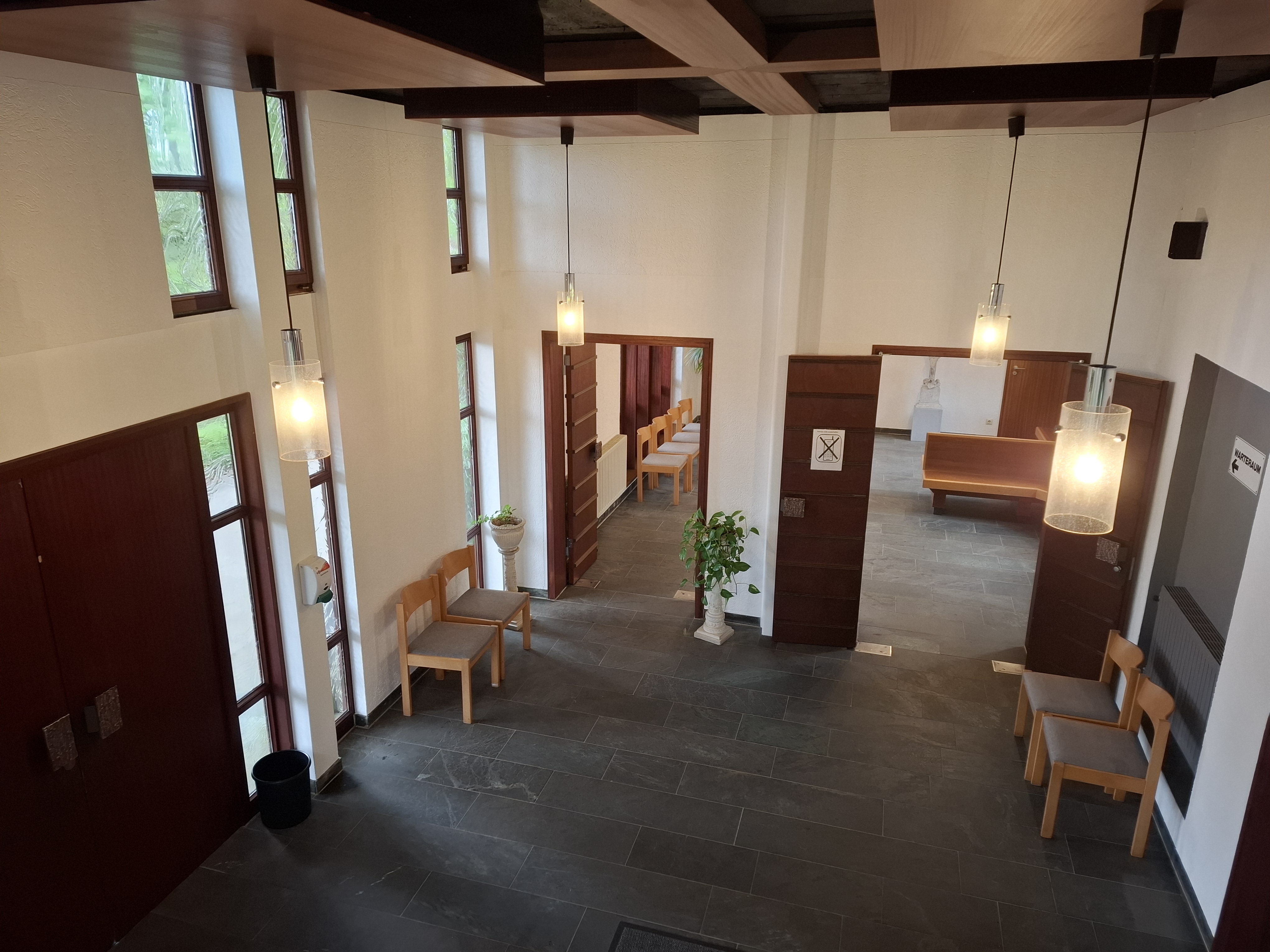 Unsere Friedhofskapelle befindet sich direkt am Haupteingang, in der Paplitzer Straße 10. Kostenlose Parkplätze finden Sie direkt vor dem Friedhof oder auf unserem Parkplatz am Glockenturm. Unsere Kapelle bietet Platz für ca. 60 Personen und verfügt über eine Orgel. Hinter der Kapelle befinden sich die Toiletten. Die Bestattungsunternehmen, sowie unsere Trauergäste werden durch eine Kapellenfrau betreut. Der barierefreie Zugang ist durch den Nebeneingang möglich. Ebenso stellen wir bei Bedarf einen Rollstuhl kostenlos zur Verfügung. Sprechen Sie unsere Mitarbeiter*Innen an, oder fragen Sie in Ihrem Bestattungsunternehmen.